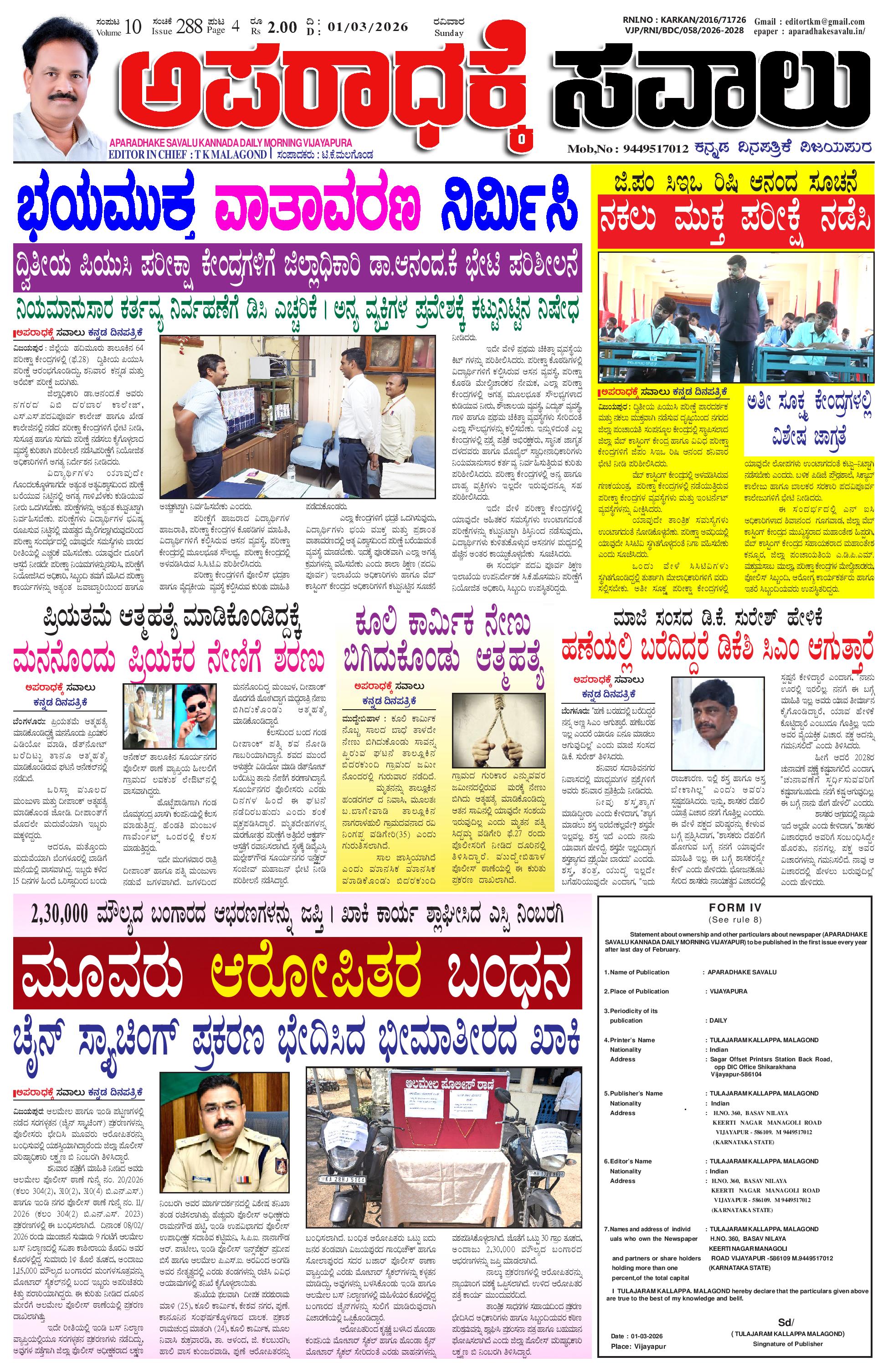 ಅಪರಾಧಕ್ಕೆ ಸವಾಲು MARCH 01-03-2026 ePaper February 01, 2026 APARADHAKE SAVALU KANNADA DAILY MORNING NEWS PAPER VIJAYAPUR << First << 1 >> Last >> Page 1Page 2Page 3Page 4 × ಅಪರಾಧಕ್ಕೆ ಸವಾಲು MARCH 01-03-2026 ePaper P-1P-2P-3P-4 << First << 1 >> Last >> P-1 P-2P-3P-4 P-1