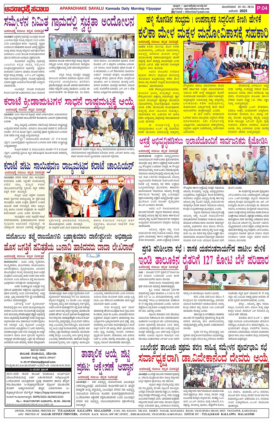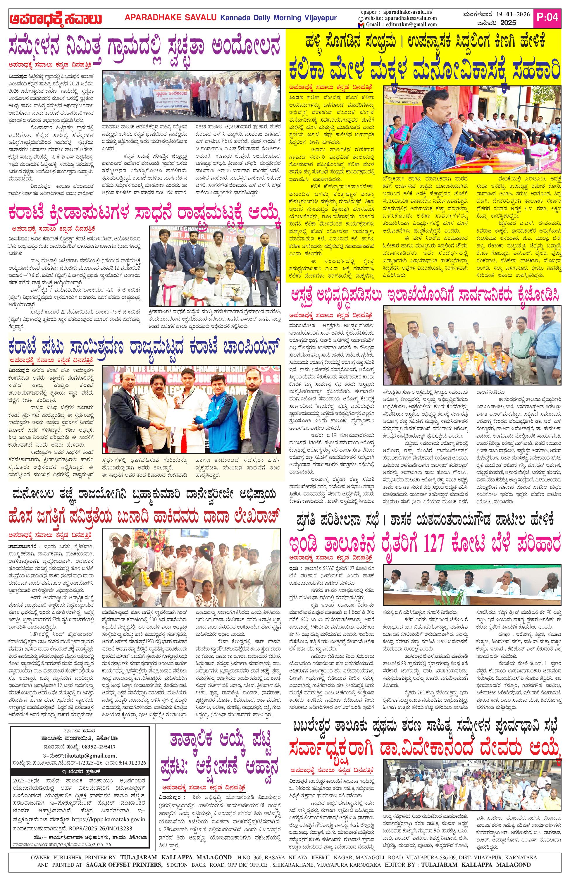 ಅಪರಾಧಕ್ಕೆ ಸವಾಲು JANUARY 20-01-2026 ePaper Page: 4 January 20, 2026 APARADHAKE SAVALU KANNADA DAILY MORNING NEWS PAPER VIJAYAPUR << First << 4 >> Last >> Page 1Page 2Page 3Page 4 × ಅಪರಾಧಕ್ಕೆ ಸವಾಲು JANUARY 20-01-2026 ePaper P-1P-2P-3P-4 << First << 4 >> Last >> P-1P-2P-3P-4 P-4
