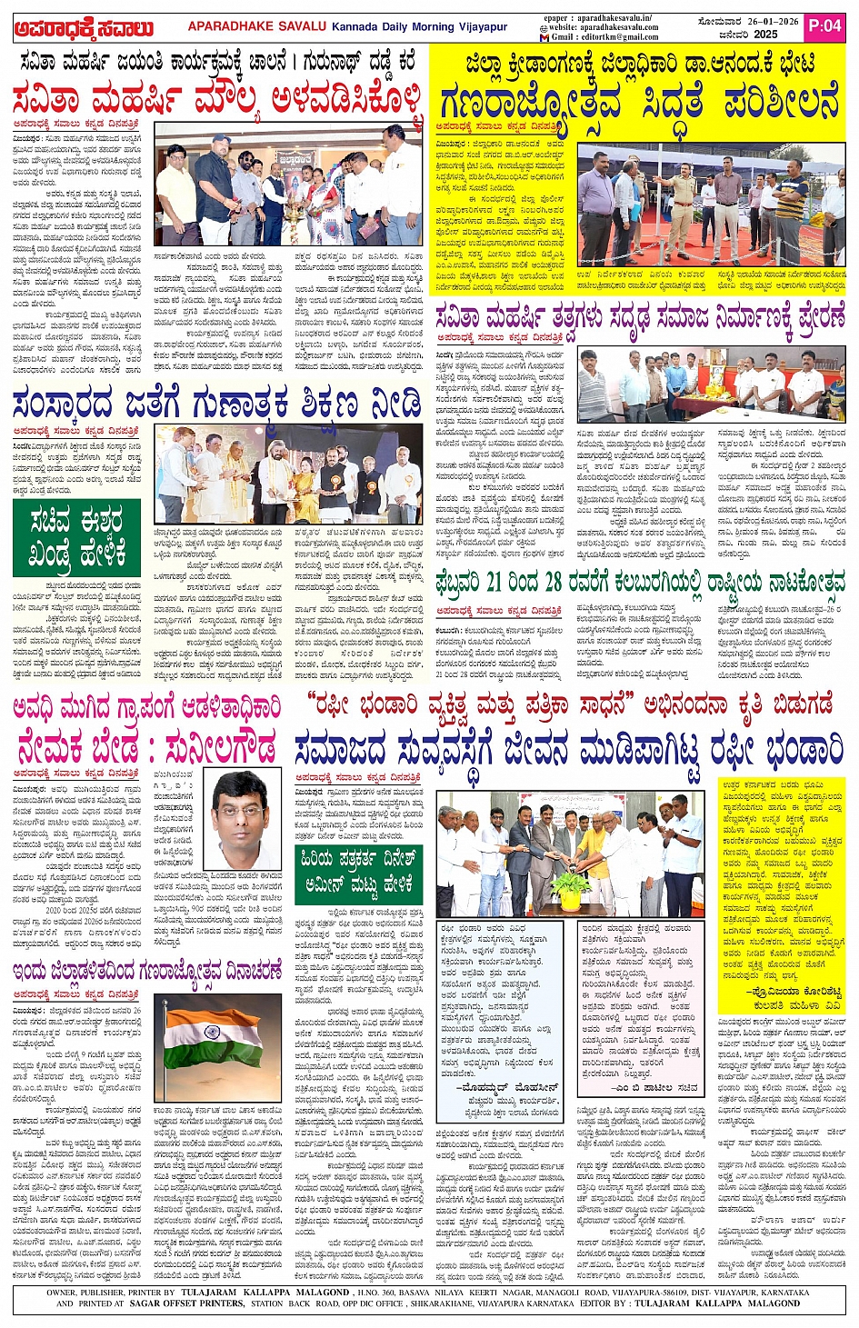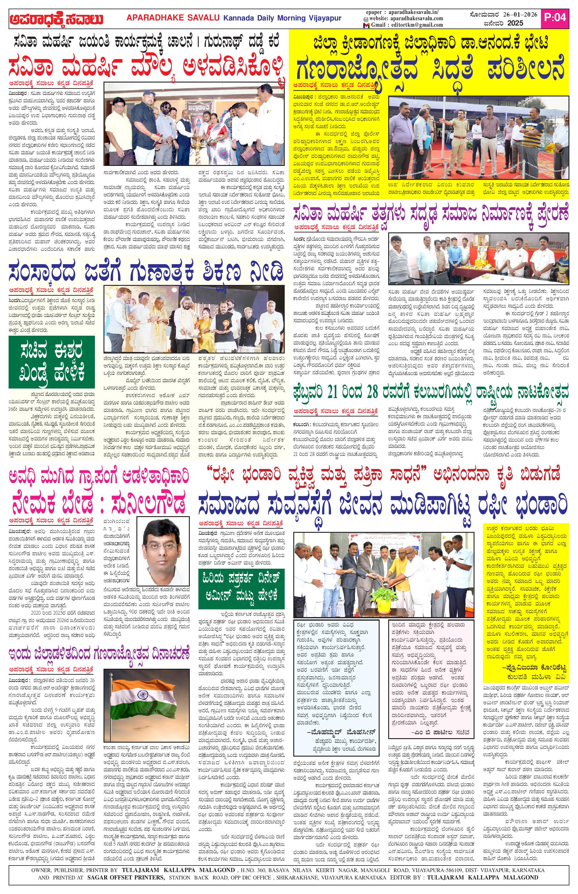ಅಪರಾಧಕ್ಕೆ ಸವಾಲು JANUARY 26-01-2026 ePaper Page: 4 January 26, 2026 APARADHAKE SAVALU KANNADA DAILY NEWS PAPER VIJAYAPUR << First << 4 >> Last >> Page 1Page 2Page 3Page 4 × ಅಪರಾಧಕ್ಕೆ ಸವಾಲು JANUARY 26-01-2026 ePaper P-1P-2P-3P-4 << First << 4 >> Last >> P-1P-2P-3P-4 P-4