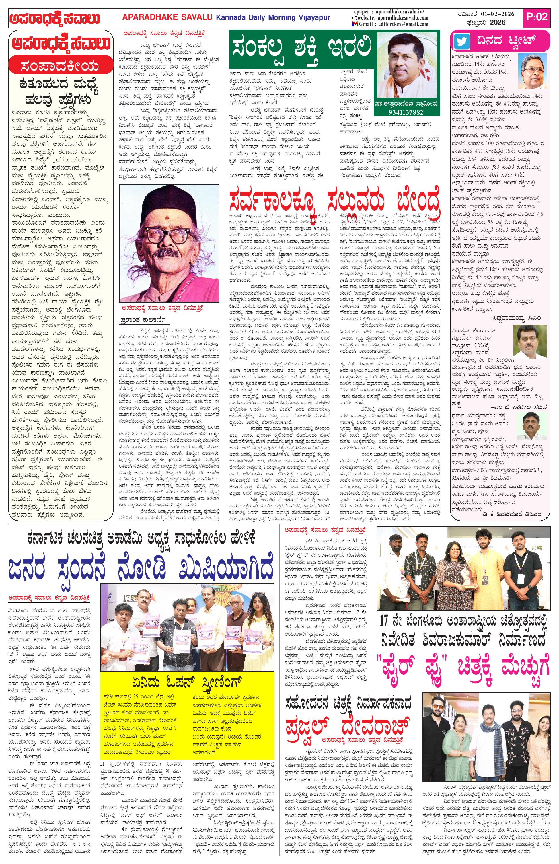 ಅಪರಾಧಕ್ಕೆ ಸವಾಲು FEBRUARY 01-02-2026 ePaper Page: 2 February 01, 2026 APARADHAKE SAVALU KANNADA DAILY MORNING NEWS PAPER VIJAYAPUR << First << 2 >> Last >> Page 1Page 2Page 3Page 4 × ಅಪರಾಧಕ್ಕೆ ಸವಾಲು FEBRUARY 01-02-2026 ePaper P-1P-2P-3P-4 << First << 2 >> Last >> P-1P-2P-3P-4 P-2