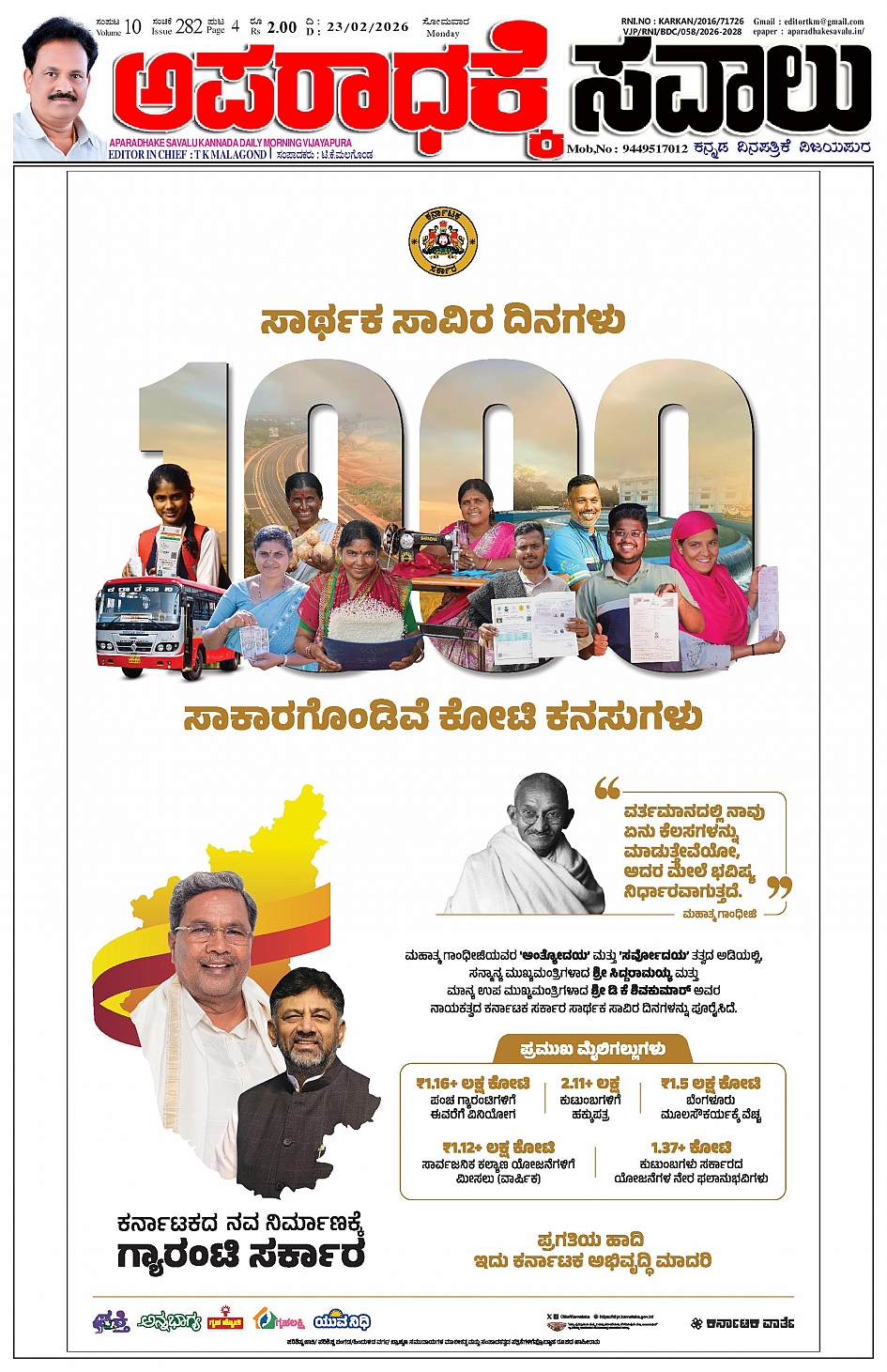 ಅಪರಾಧಕ್ಕೆ ಸವಾಲು FEBRUARY 23-02-2026 ePaper February 23, 2026 APARADHAKE SAVALU KANNADA DAILY MORNING NEWS PAPER VIJAYAPUR << First << 1 >> Last >> Page 1Page 2Page 3Page 4 × ಅಪರಾಧಕ್ಕೆ ಸವಾಲು FEBRUARY 23-02-2026 ePaper P-1P-2P-3P-4 << First << 1 >> Last >> P-1P-2P-3P-4 P-1